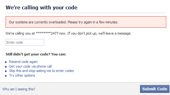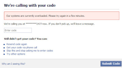 ملحوظة: إذا حاولت الدخول على الفيسبوك من جهاز جديد، وبقيت فترة في انتظار رسالة الإس إم إس التي تحتوي على رمز الدخول السري، ولم تصل الرسالة، فإن السبب عادة ما يكون الضغط الشديد على سيرفر الفيسبوك بحيث أنه يقوم حاليا بإرسال آلاف وربما ملايين الرسائل الإس إم إس إلى موبايلات أخرى حول العالم وهذا هو ما أدى إلى تأخر رسالتك.